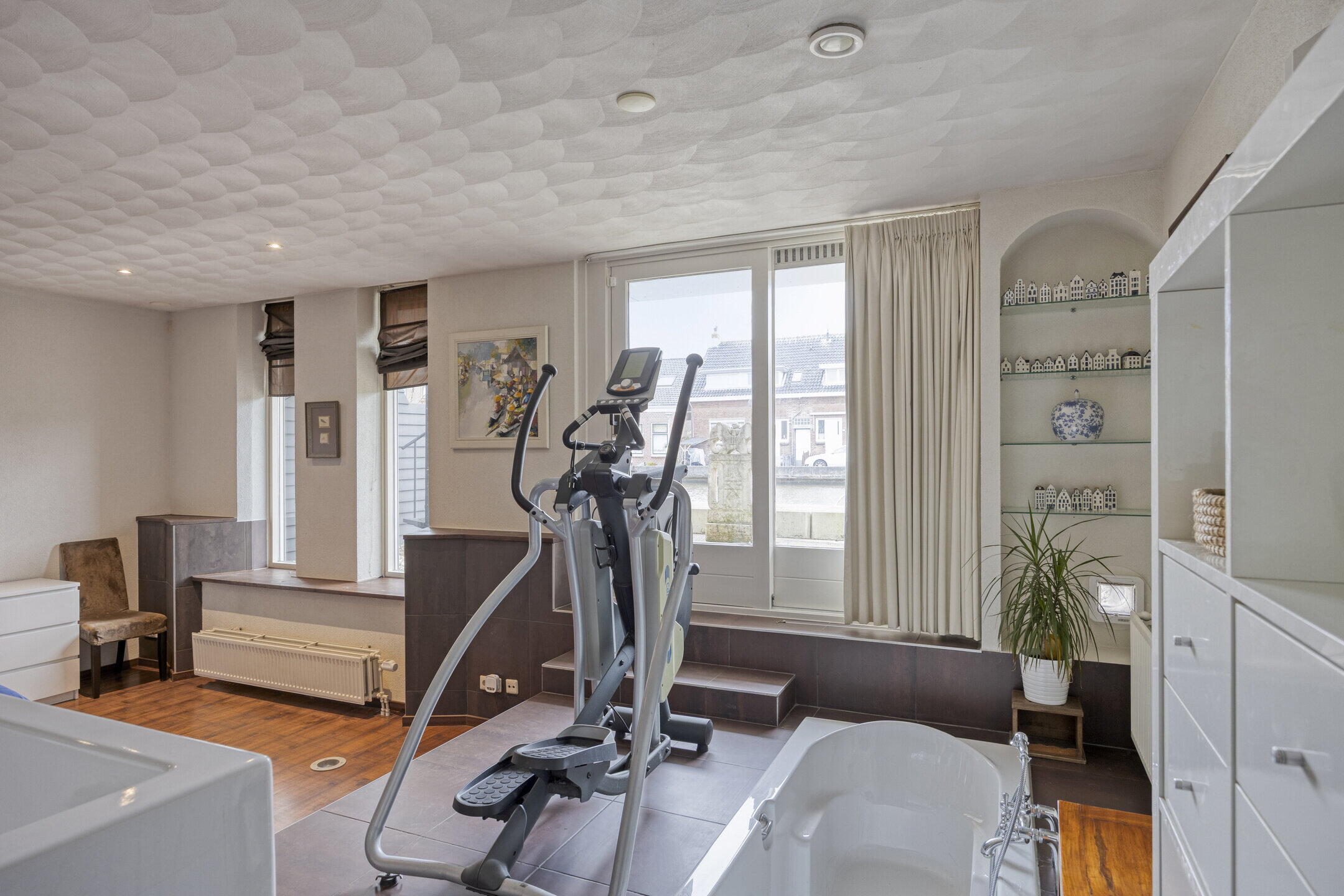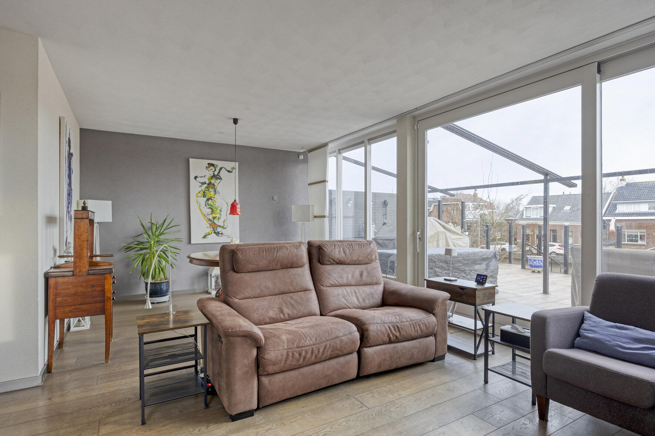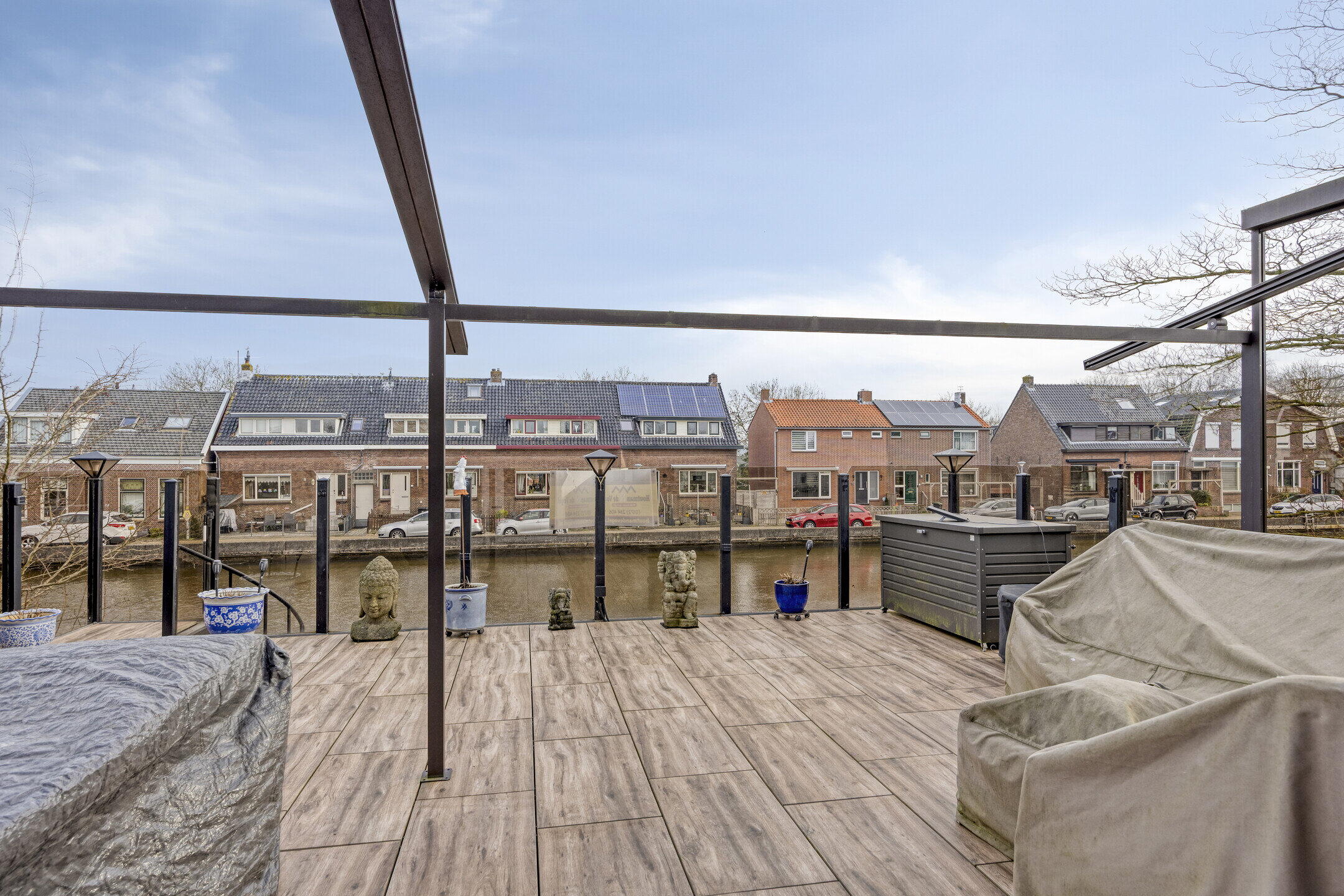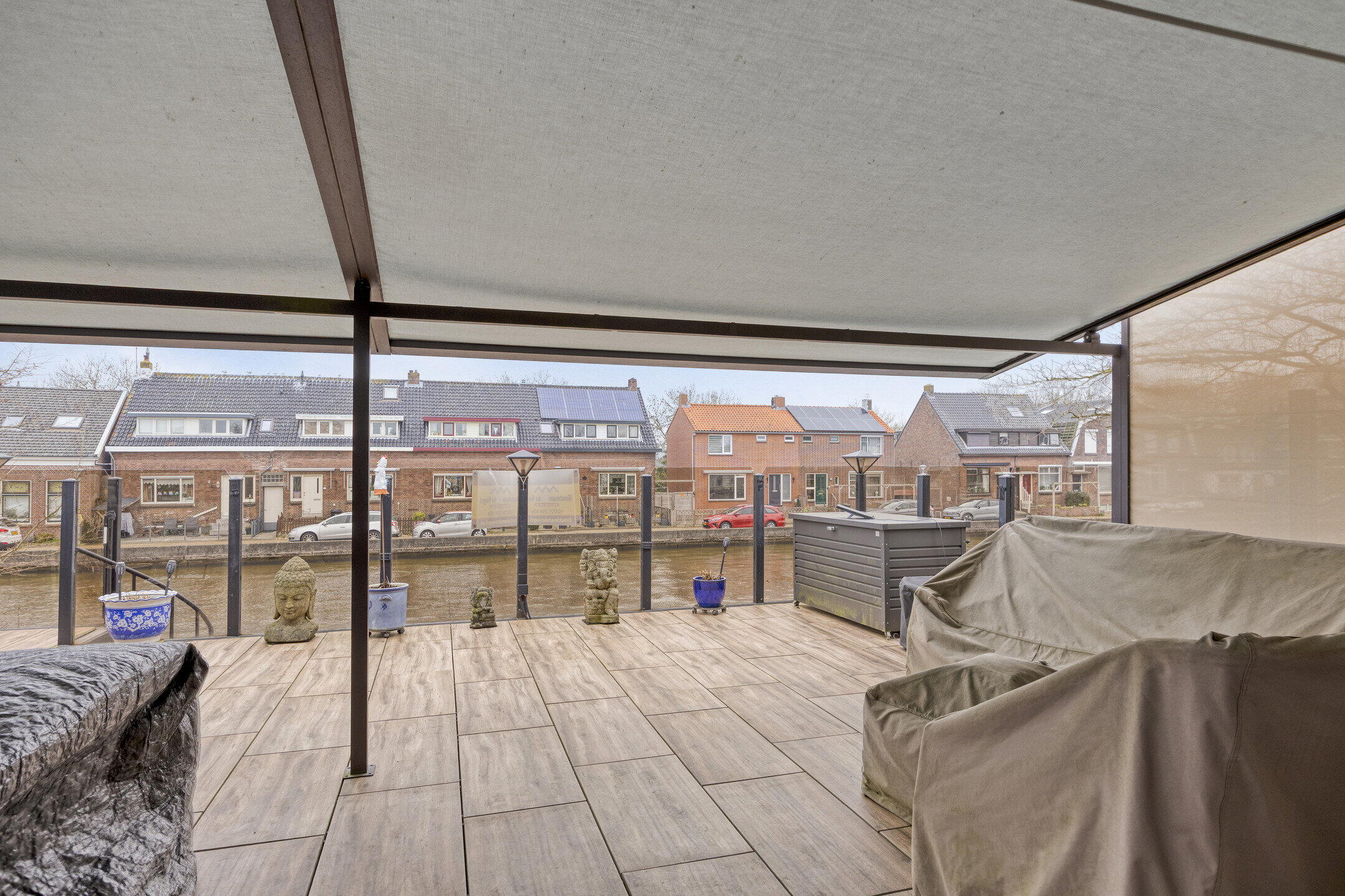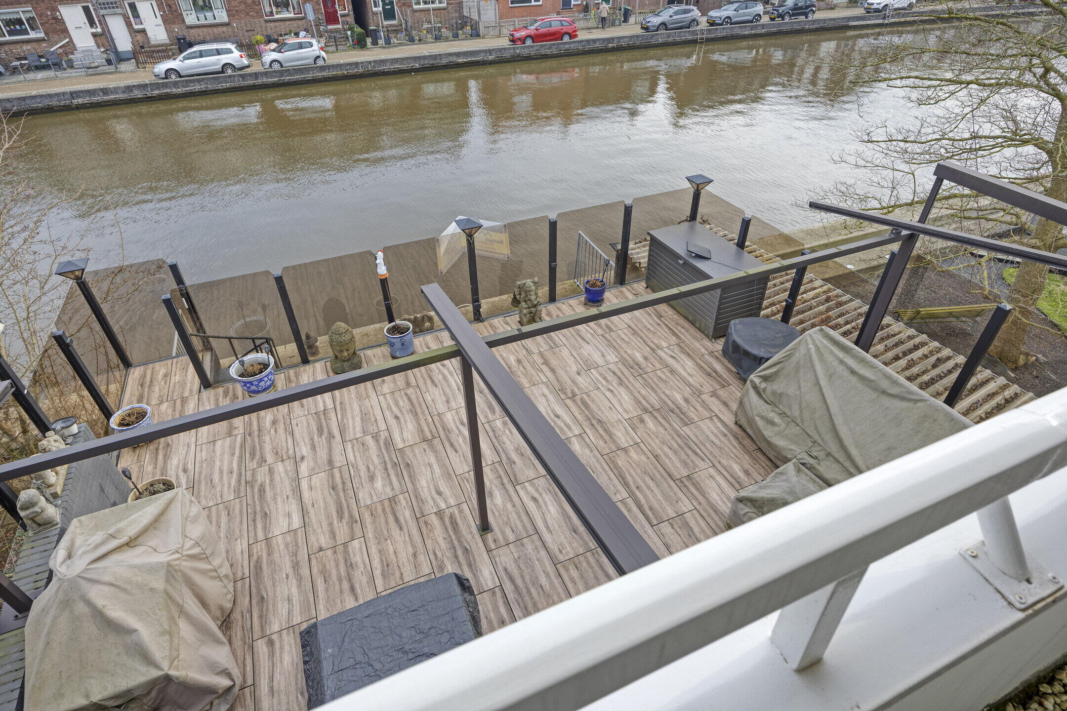 Eén van de meest indrukwekkende kenmerken van deze woning is het ruime dakterras op de eerste verdieping. Via de buitentrap of via de schuifpui in de woonkamer bereikt u dit dakterras van maar liefst 45 m², dat voorzien is van een elegante pergola met een schuifdak. Het dakterras biedt een panoramisch uitzicht op het water en is omheind met glazen panelen, waardoor u zelfs op winderige dagen comfortabel buiten kunt genieten. Dit is de ideale plek om te ontspannen, te dineren met vrienden of gewoon te genieten van de serene omgeving.